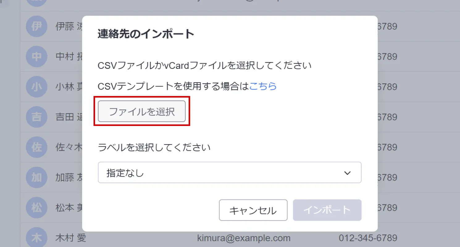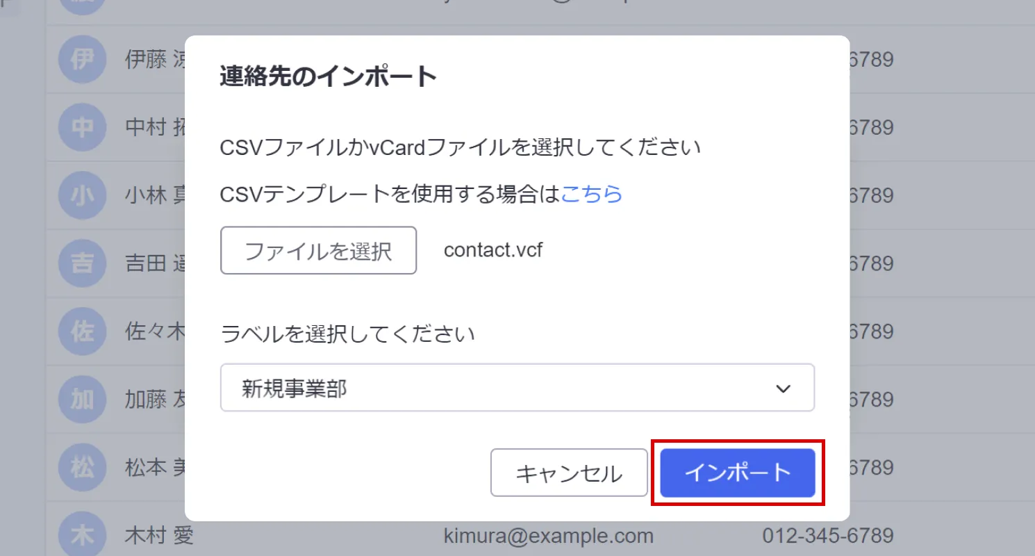 6[インポート]をクリックすると、選択したファイルの連絡先が読み込まれます。