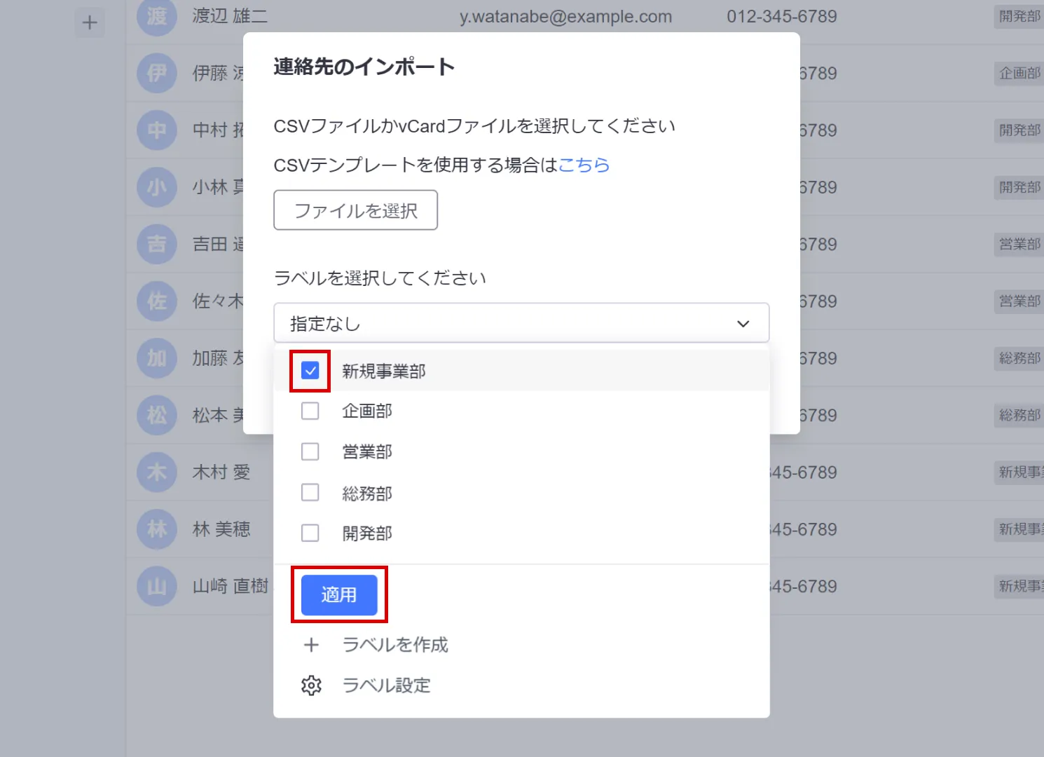 7ラベルを付けたい場合は「追加するラベル」を選択し、[適用]をクリックします。